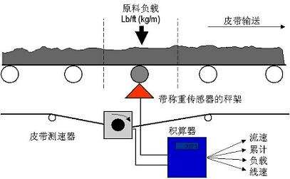 電子皮帶秤由稱重裝置、稱重傳感器、測速傳感器和稱重顯示器組合而成。電子皮帶秤稱重時,稱重裝置將皮帶上物料的重力傳遞到稱重傳感器上,稱重傳感器的輸出與物料重力的電壓信號形成正比,而經(jīng)過放大器放大后送模/數(shù)轉換器變成數(shù)字量A,送到運算器;物料速度輸入速度傳感器后,速度傳感器即輸出脈沖數(shù)B,也送到運算器;運算器對A、B進行運算后,即得到這一測量周期的物料量。對每一測量周期進行累計,即可得到皮帶上連續(xù)通過的物料總量。